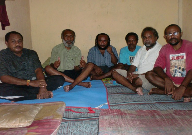 Papuan Leaders take a sit in floor of Papuan Police Prison. From left to right each of them; Edsison Waromi SH (Prime Minister), Forkorus Yaboisembut S.Pd ( President Republic Federal State of West Papua), Dominikus Surabut ( Aktivist)), Gad Wenda (Aktivist ), Agus Senandy Kraar (Aktivist ) and Selpius Bobii (Chair of Orginizing Commettee of Third National Papua Congress). (Photo: West Papua Media)