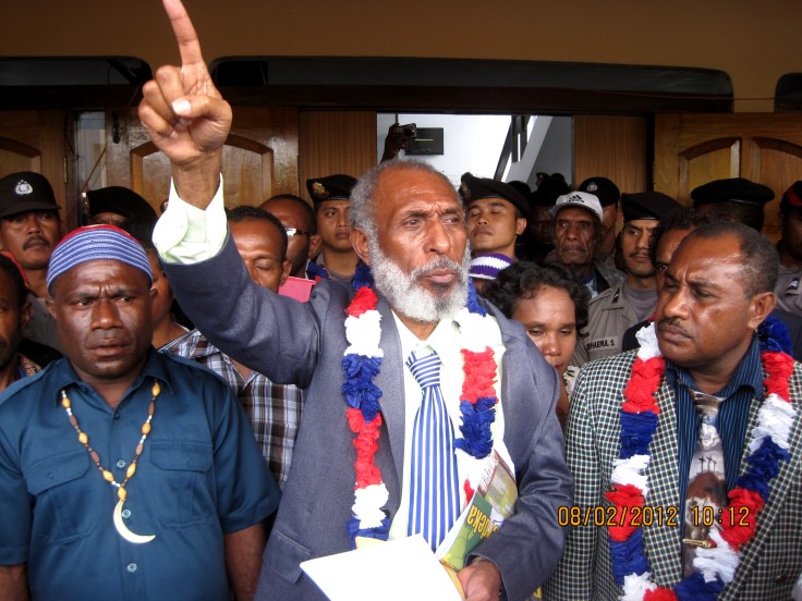 The five defendants, Forkorus Yaboisembut, Edison Waromi, Selfius Bobii, Dominikus Sorabut, and Agus Kraar, were leaders and organisers of the Third Papuan People’s Congress held on October 19 2011, which was brutally broken up by Indonesian security forces after Forkorus  – the Chairman of the Papuan Tribal Council elected as President of the Federated Republic of West Papua – unilaterally reaffirmed West Papua’s independence from Indonesia.