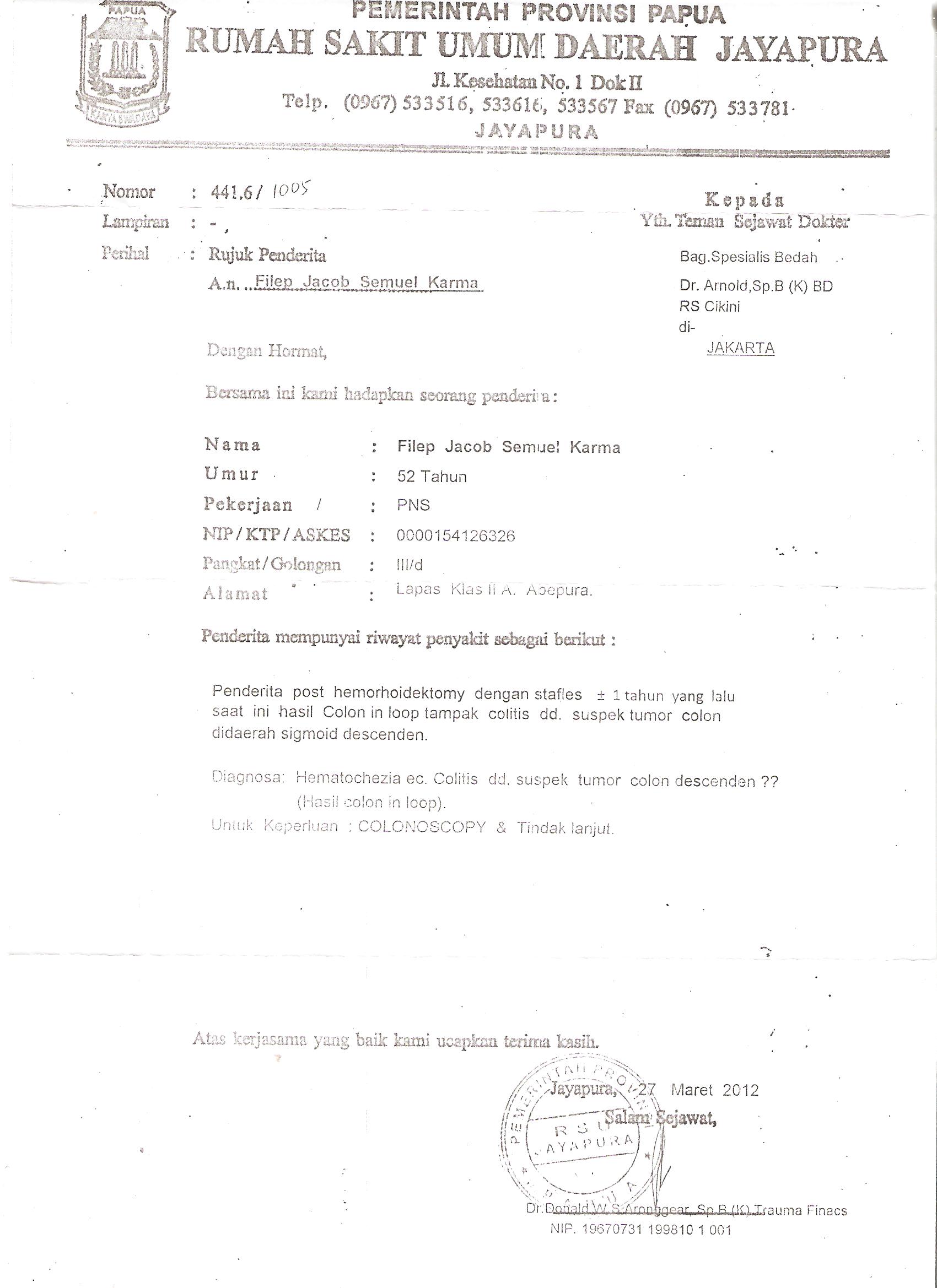 Karma has been referred by the Dok 2 Head of Trauma to the Department of Surgery Specialist, Dr D. Arnold, Sp.B (K) BD, in Cikini. Filep had already been undergoing treatment in Jakarta separately for his prostrate. On 13 April 2012, Dr Hidayathu Samawi, the general practitioner in Abepura prison, called Karma to his rooms. Dr Hidayathu said that Karma must provide a letter of permission from the family to consent to the treatment of Jakarta, and the Letter to commit the family to bear the full cost of treatment and transport to Jakarta.
