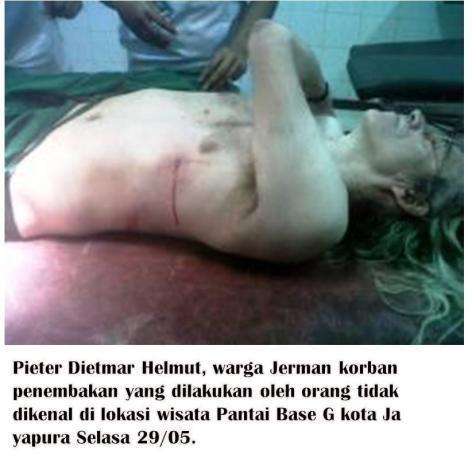 The scientist identified as Pieter Dietmar Helmut (55) was swimming with his wife and some West Papuan friends at Base G beach, when a man brazenly drove up to beach in a silver Avanza car (plate number DS 1852) and shot the man three times in the thigh, abdomen and chest from a distance of ten metres – allegedly with a rifle according to some witnesses, though this could not be independently confirmed.