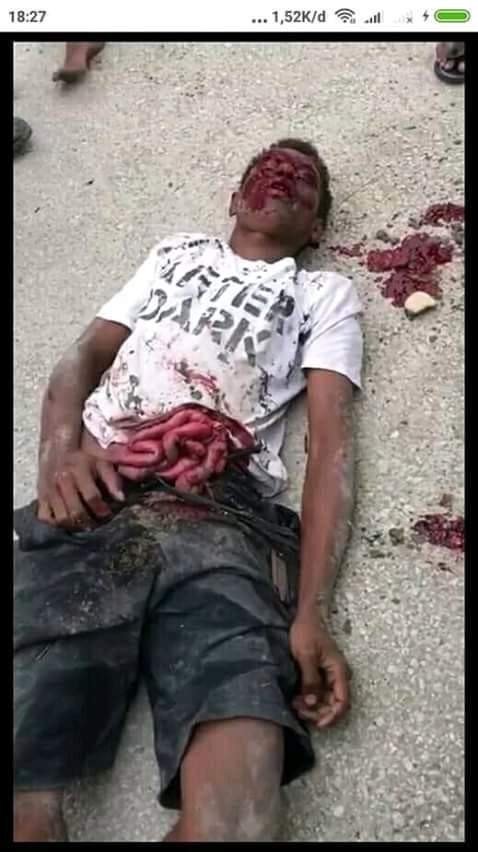 The young man, Manarson Ndrotndrot, 15, was reportedly attacked by the Barisan Merah Putih (Red and White Force) militia, and Indonesian police and military officers stood by and failed to render medical assistance. According to confidential sources, after sustaining a stomach wound from a machete, Manarson was stood over by soldiers and militia men for several minutes whilst his intestines were falling out and he was in clear distress. This can be seen clearly in the footage.